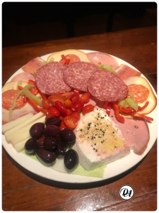Μορταδέλα με φυστίκη Αιγίνης, Σπέκ, Σαλτσίτσια, Θάσου πικάντικο, ντοματίνια, ελιές, πιπιριές, ανθότυρο Κρήτης, και Κεφαλογραβιέρα Αμφιλοχίας.