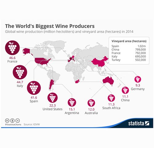 Το 2012, η Ιταλία ήταν ο κορυφαίος παραγωγός κρασιού στον κόσμο, ακολουθούμενος από την Γαλλία, Ισπανία, τις Ενωμένες Πολιτείες και την Αργεντινή.