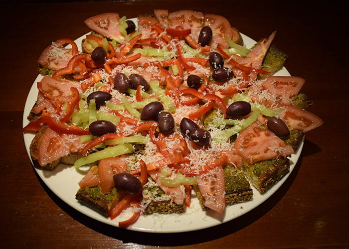 Επάνω σε ψημένο ζυμωτό ψωμί που παίρνουμε από τον ξυλόφουρνο της περιοχής μας απλώνουμε σάλτσα πέστο βασιλικού, φέτες ντομάτας ,πιπεριές κόκκινες, πράσινες, μαύρες ελιές και τριμμένη 12μηνη παρμεζάνα.