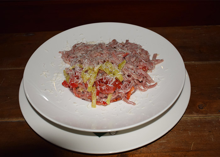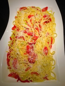 Λιγκουίνι με πιπεριές, ντοματίνια, οκτώ τυριά (Νιβατό ,καπνιστό Βερμίου,Blue cheese, Gorgonzola,Provolone,Pecorino Romano,Parmigiano reggiano 24μηνη και τέλος Κεφαλογραβιέρα Αμφιλοχίας)!!!!