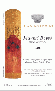 Σε φιάλη η οποία κοσμείται από έργο του Δημήτρη Γαλιατσάτου, το Μαγικό Βουνό 2003, ωρίμασε για 16 μήνες σε καινούρια δρύινα βαρέλια. Το πασίγνωστο οινοποιείο της Αγοράς, έχει την ικανότητα να παράγει για πολλά χρόνια υψηλής ποιότητας Bordeaux blend κρασιά.