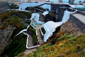 Χτισμένο στην άκρη της καλντέρας ακριβώς πάνω από τον όρμο του Αθηνιού, το Οινοποιείο Βενετσάνου είχε την ιδιαιτερότητα ότι σχεδιάστηκε για να αξιοποιήσει το νόμο της βαρύτητας, δεδομένης της έλλειψης ηλεκτρικής ενέργειας εκείνης της εποχής. Λόγω της κλίσης του εδάφους κατασκευάστηκε σε τέσσερεις ορόφους ο καθένας με διαφορετικό στάδιο οινοποίησης και όπου η μεταφορά του οίνου γινόταν με τη φυσική ροή. Στον πρώτο, τη λεγόμενη ταράτσα, υπήρχε το ζυγιστήριο και οι σταφυλοδόχοι. Στον αμέσως από κάτω, τα μηχανήματα αποράγισης και η ηλεκτρική γεννήτρια και πιο κάτω οι δεξαμενές και τα πιεστήρια. Το τέταρτο επίπεδο ήταν το υπόγειο με τους κρουνούς των δεξαμενων. Από εκεί το κρασί με σωλήνες κατρακυλούσε με σωλήνες στο λιμάνι και στα καράβια που το οδηγούσαν σε λιμάνια του εξωτερικού.