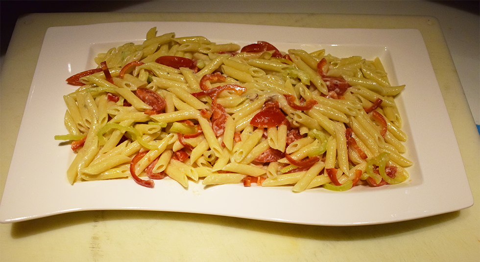 Ζυμαρικά με, πιπεριές, φρέσκο κρεμμύδι, ντοματίνια, ελιές, φινόκιο, Τόνο, 24μηνη παρμεζάνα.