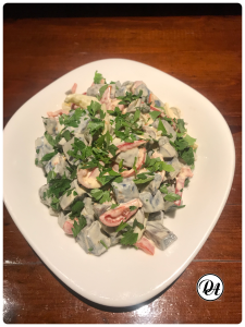 Μαύρη-Μπλε πατάτα Περού, Ντοματίνια βίο, Αγγουράκια τουρσί, Πιπεριές πράσινες κέρατο, κόκκινες Φλωρίνης, Κρεμμύδι ξερό, Κρεμμύδι χλωρό, μαιντανό, κάπαρη ή κρίταμο, ρίγανη βίο, Θαλασσινό Ανθό αλατιού Μεσολογγίου με βότανα βίο, Χυμο λεμονιού, Μαγιονέζα, Ελαιόλαδο έξτρα παρθένο.