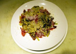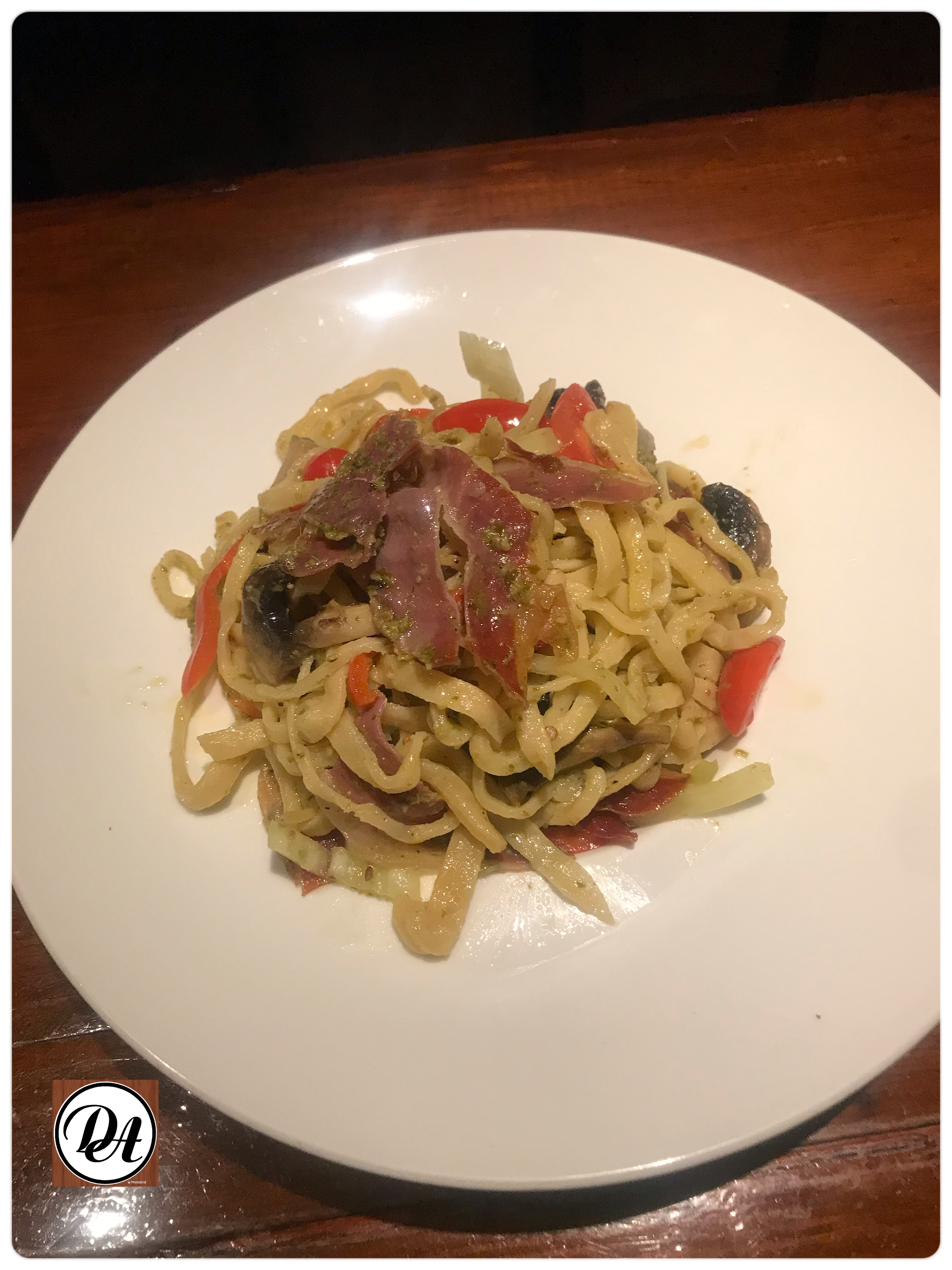 Φαρφάλες με πιπεριές, μανιτάρια, σαλάτα, ντοματίνια, τραγανό προσούτο, κουκουνάρια, πέστο βασιλικού, παρμεζάνα.