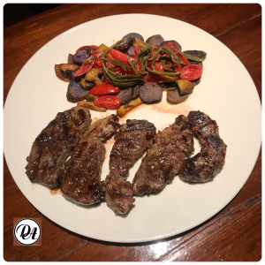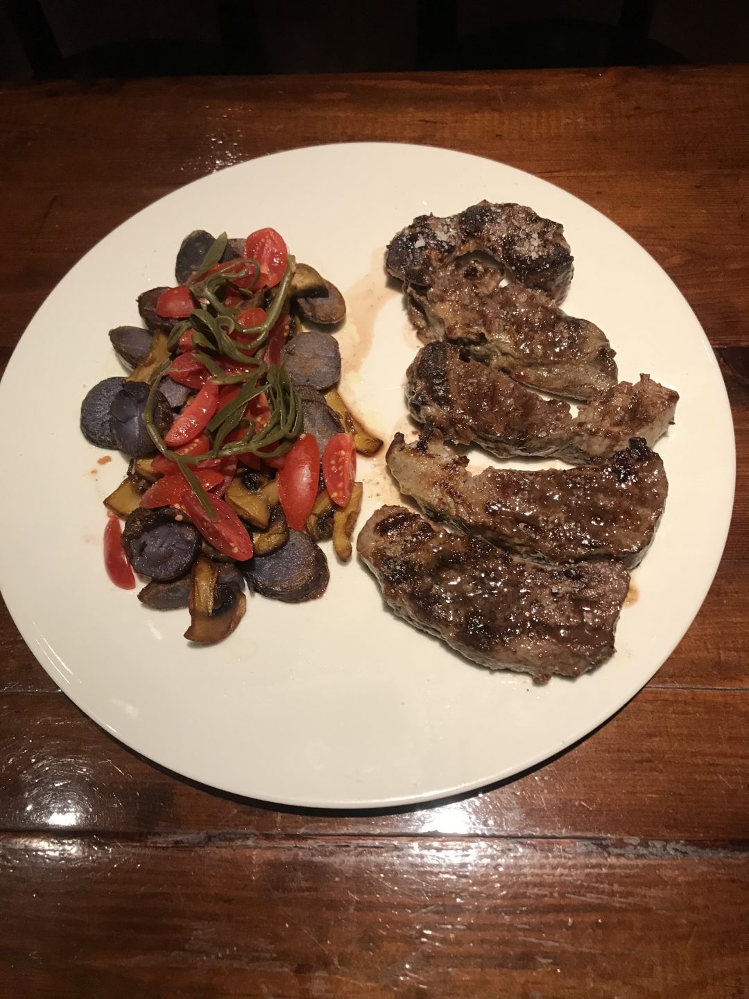 Συνοδεύεται από μαύρη πατάτα (όταν υπάρχει), μανιτάρι και φορμαέλα περασμένα όλα από το τηγάνι με ελάχιστο έξτρα παρθένο ελαιόλαδο.