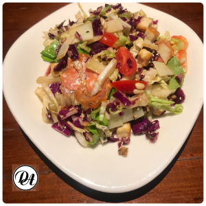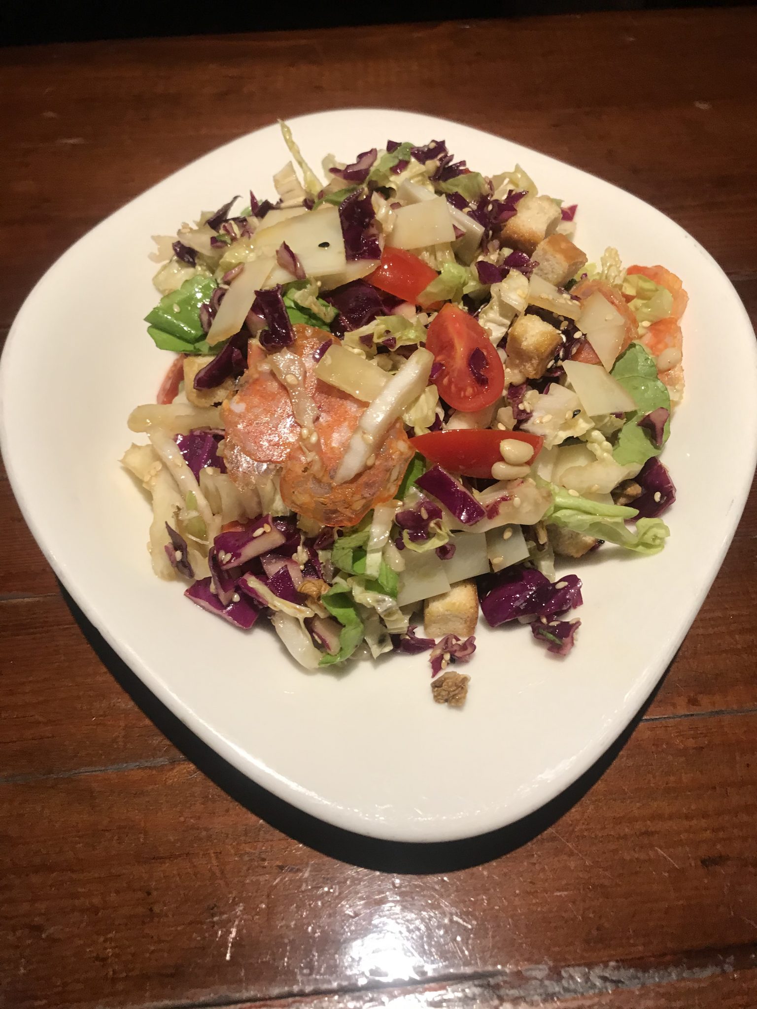 Κόκκινο λάχανο, σαλάτα, κινέζικο λάχανο, κρουτόν, καρύδια, σουσάμι, τυρί provolone, αλλαντικό πικάντικο Salsicia, ντοματίνια, εξαιρετικό παρθένο ελαιόλαδο & balsamico ή λεμόνι.