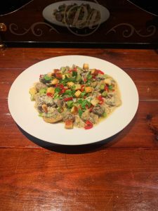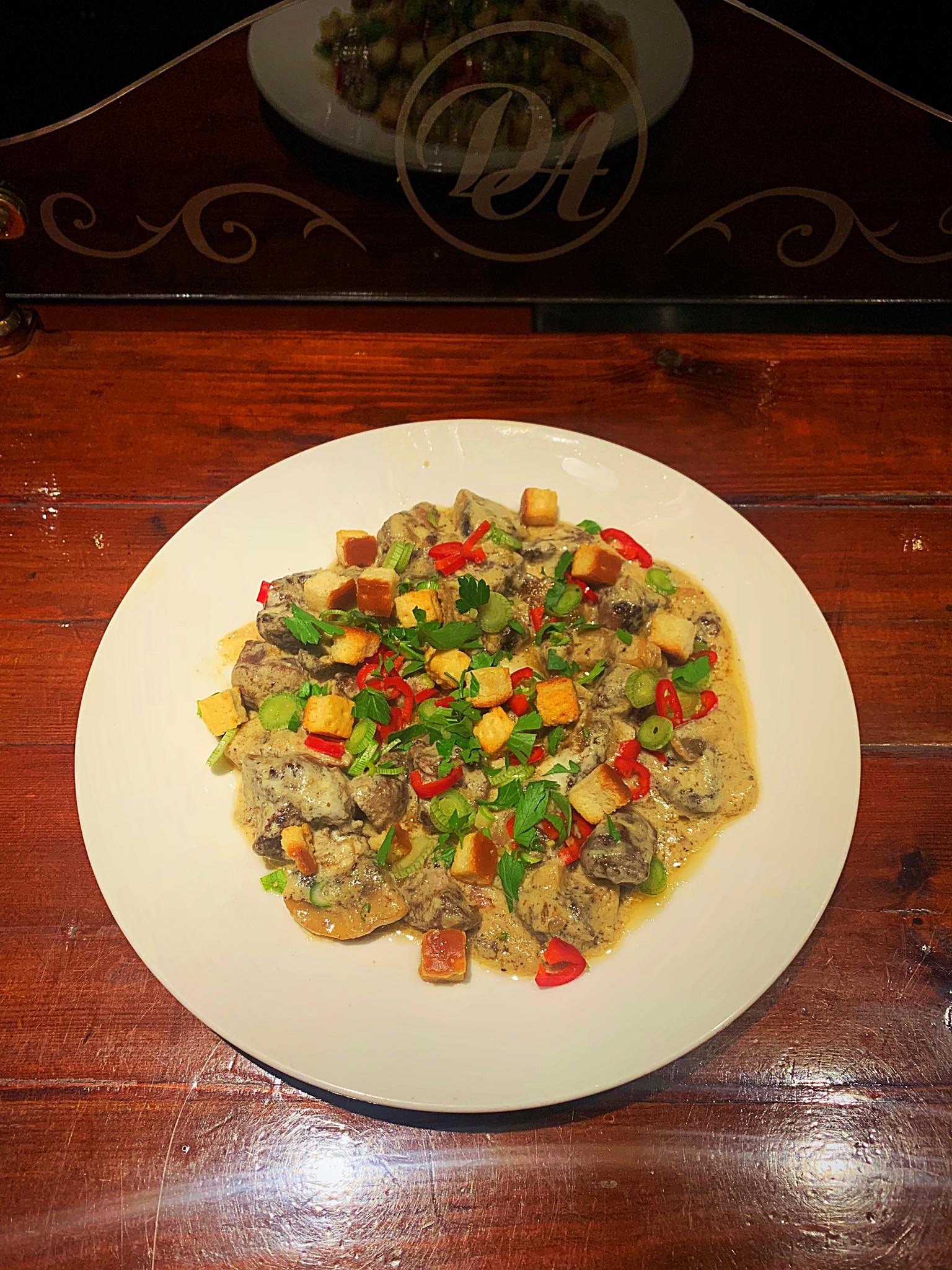 Συστατικά . Νεφρά μοσχαριού, μανιτάρια λευκά, κρεμμύδι φρέσκο, πιπεριά τσίλι, σκόρδο, κρουτών, σάλτσα μαγιονέζας με μουστάρδα και κρέμα γάλακτος.