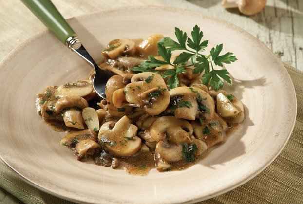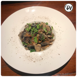 Πέντε είδη φρέσκων μανιταριών περασμένα από το τηγάνι με ελάχιστο βούτυρο, σκόρδο, κρεμμύδι, λεμόνι και χοντρό αλάτι Μεσολογγίου σβησμένα (αν το θέλετε και εσείς) με κρέμα από μαγιονέζα (φτιαγμένη από εμάς) και gorgozola.