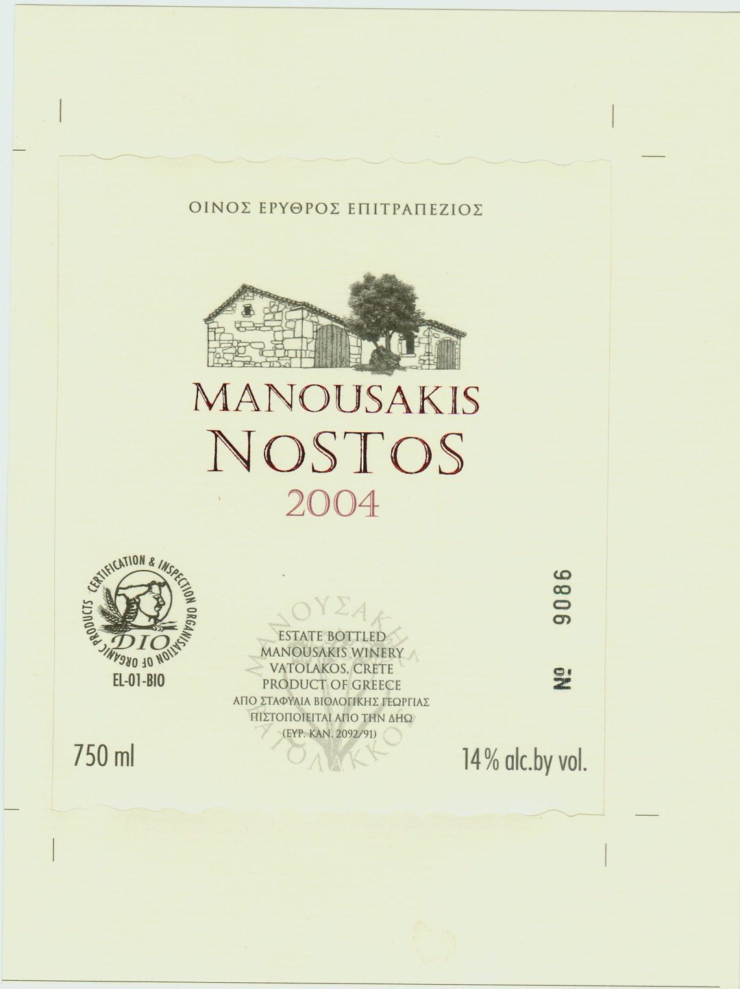 Το Nostos Manousakis , εμφανίζεται στο ποτήρι με βαθύ -σχεδόν αδιαπέραστο-ρουμπινί χρώμα,  ενώ στην μύτη αναδύονται θεαματικά αρώματα ώριμων μαύρων φρούτων, γλυκόριζας, δαμάσκηνου, απίθανες νότες κέδρου, καπνού, δέρματος και αποξηραμένων λουλουδιών. Στο στόμα το γεμάτο -και ακόμα φρέσκο- ξηρό αυτό κρασί δεν έχει καθόλου γωνίες, ενθουσιάζοντας με την πυκνότητα και ποιότητα του φρούτου και τις αναπάντεχα ώριμες τανίνες. Το ψηλό αλκοόλ  προσθέτει μια ψευδαίσθηση γλυκύτητας στο τέλεια ισορροπημένο αυτό χαρμάνι. Η υπέροχη αίσθηση φρούτων και γλυκών τανινών εμπλουτίζεται από έξοχες νότες κέδρου και μπαχαρικών που οδηγούν σε μια επίμονη και συναρπαστική επίγευση. Ένα κρασί βιολογικής καλλιέργειας με μεγάλη ακρίβεια, κομψότητα, απίθανη συγκέντρωση που μπορείτε να απολαύσετε τώρα αλλά και με τρομερή σιγουριά  μέσα στην επόμενη δεκαετία.